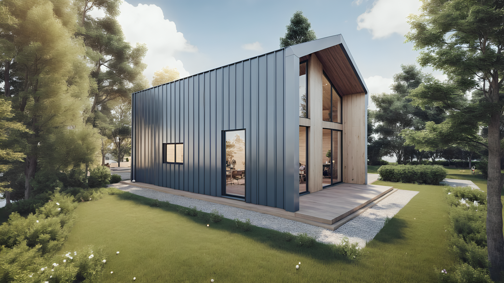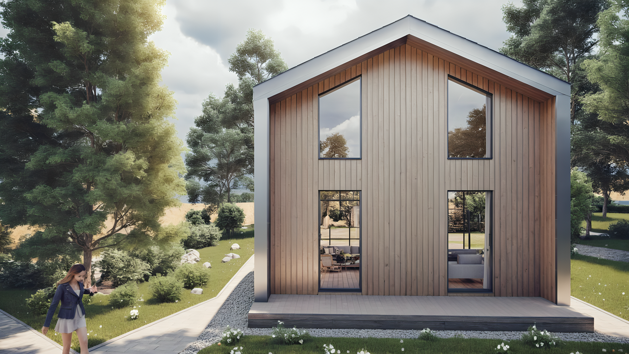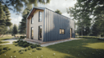 Проект каркасного дома "Барнхаус" на 65 м2, с одной спальней, просторной кухней-гостиной и террасой. Возможны комплектации для постоянного проживания или дачного варианта