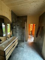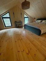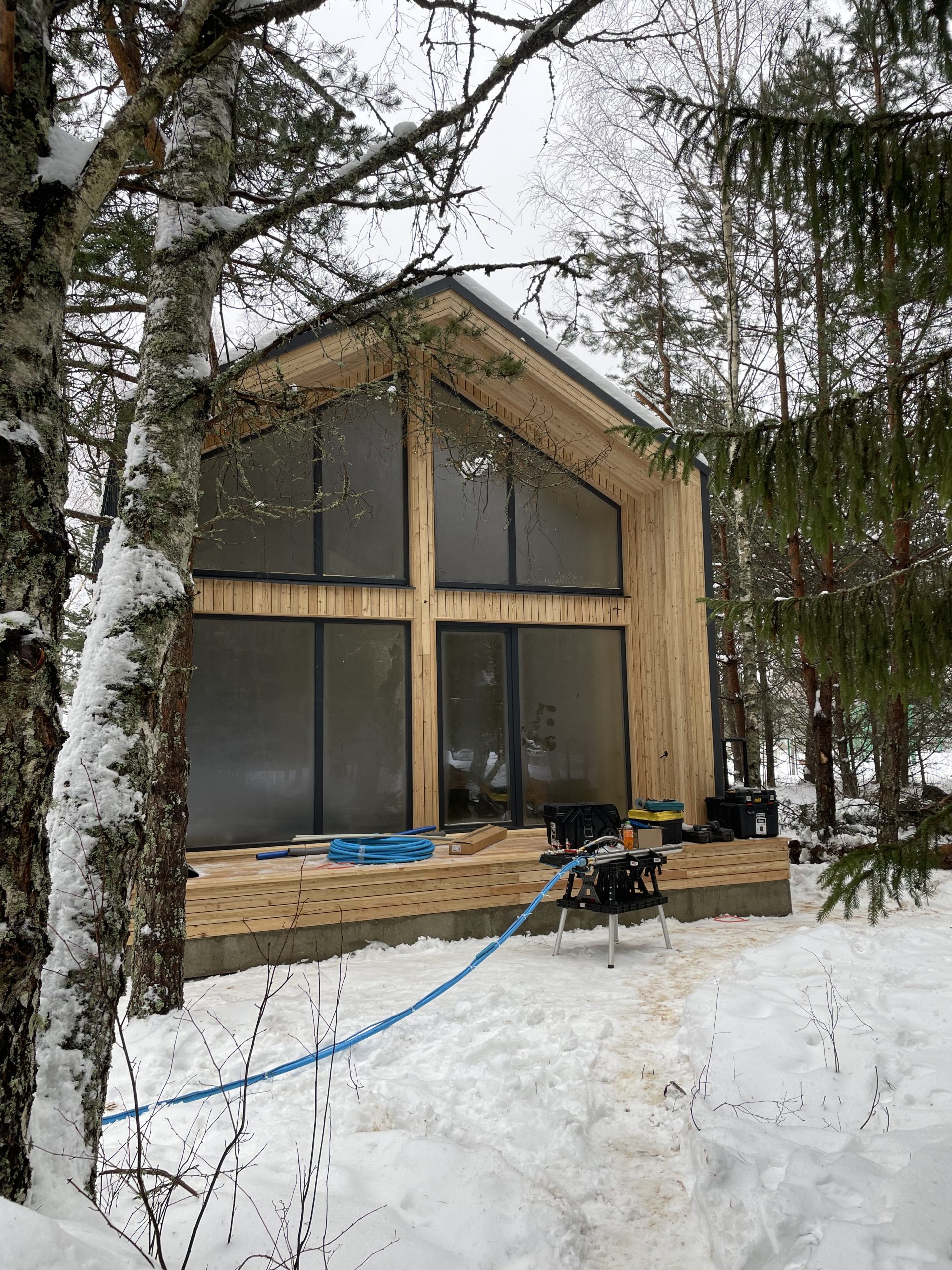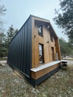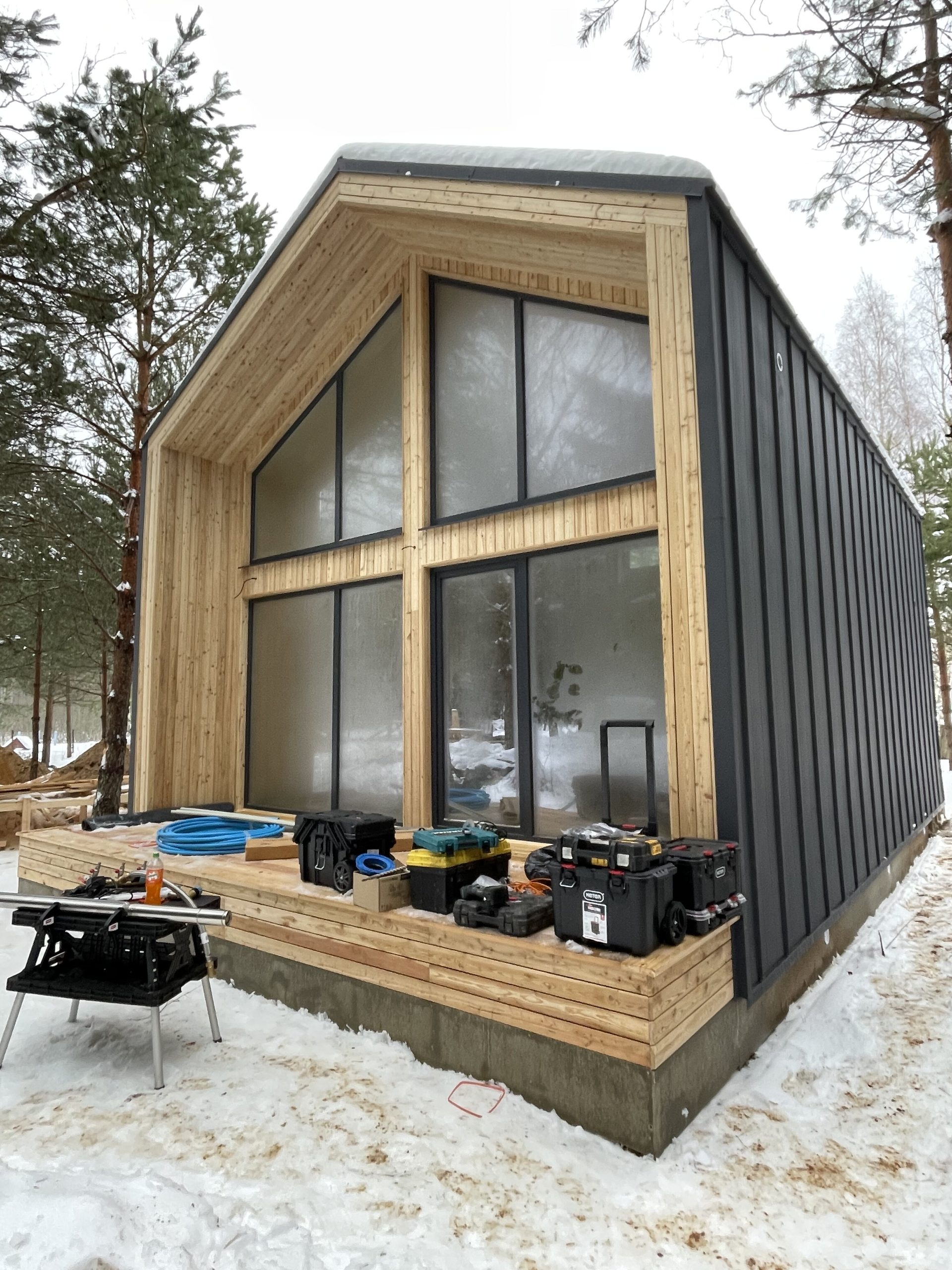 Внешняя и внутренняя покраска, межкомнатные двери, покрытие пола, укладка плитки в душевой, стены душевой остаются в черновой отделке ГКЛ, установка инсталляции, унитазов, умывальника, бойлера, электрокотла, всей прочей посуды связанной с сантехникой, установка освещения в комнатах и с наружи, лестницы террас и главного входа, отделка фундамента.
