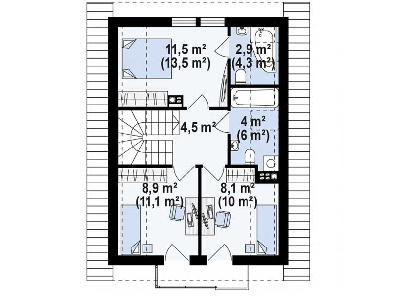 Проект двухэтажного каркасного дома на 120 м2, с четырьмя спальнями, просторной кухней-гостиной и двумя санузлами. Возможны комплектации для постоянного проживания или дачного варианта