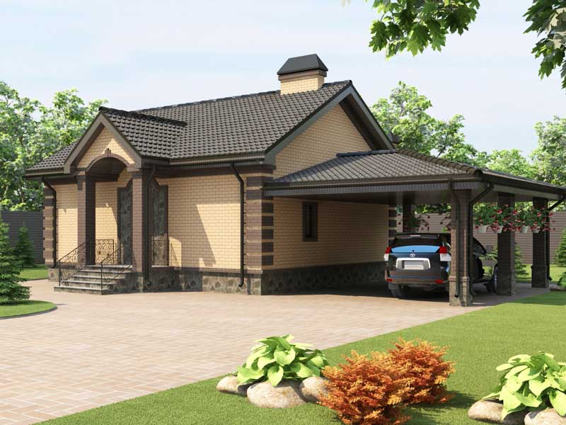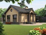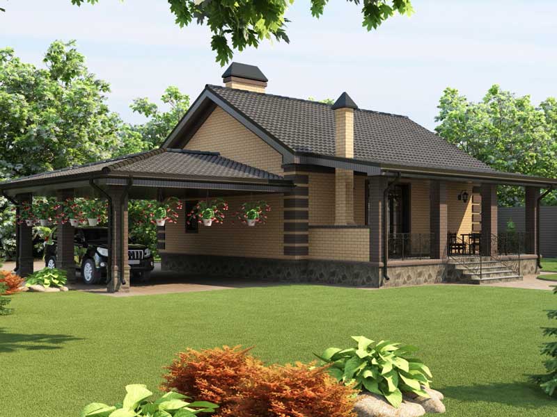 Проект одноэтажного каркасного дома 8,4 на 10 м - 84 м2, с просторной террасой, со спальней, кухней-гостиной и совмещенным санузлом. Возможны комплектации для постоянного проживания или дачного варианта