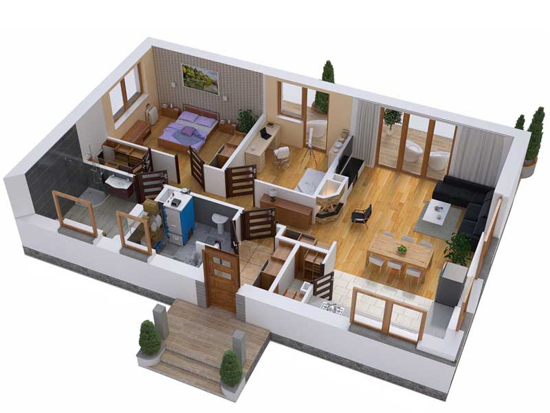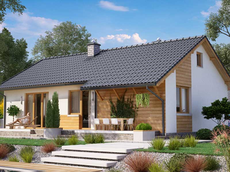 Проект одноэтажного каркасного дома 7,8 на 12,7 м - 99 м2, с двумя спальнями, просторной кухней-гостиной, отдельным помещением под котельную и раздельным санузлом. Возможны комплектации для постоянного проживания или дачного варианта